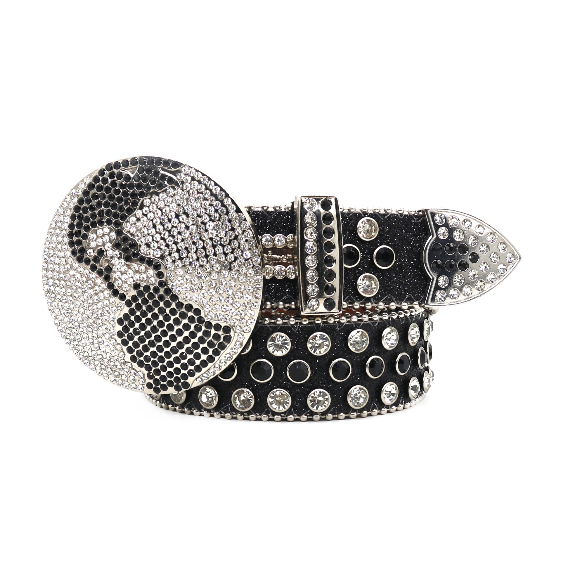 With a black and white rhinestone base, this belt is decorated with a globe-shaped large buckle and full rhinestones. It has a gorgeous and eye-catching Western style with highly personalized details, adding a trendy texture to your outfit, making it a unique choice for fashionistas to create an eye-catching look.
