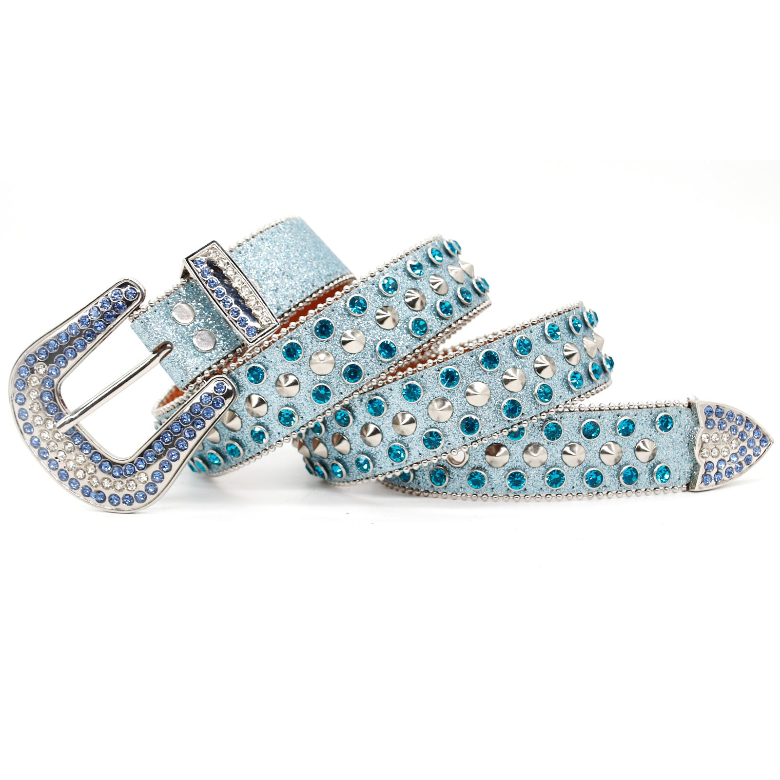 With a blue rhinestone base, this belt is decorated with metal studs and rhinestone-encrusted buckles. It has a gorgeous and eye-catching Western style with excellent texture, adding a personalized highlight to your outfit, making it a striking item for creating a cool look.